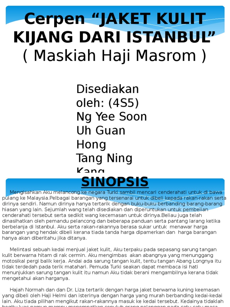Cerpen jaket kulit kijang dari istanbul. Tampak depan adalah bagian untuk bukaan jaket kulit dari leher ke bawah. Mrsm tmfs cerpen jaket kulit kijang dari istanbul (group 5). 100%100% found this document useful, mark this document as useful. Antologi tingkatan 4 jaket kulit kijang dari istanbulanimasi cerpendireka cipta oleh myteach sdn bhdproduk dalam bentuk powerpoint atm. Lihat ide lainnya tentang jaket kulit, jaket, kulit. Savesave jaket kulit kijang for later. Apakah nama watak utama di dalam cerita jaket kulit kijang dari istanbul ini? Kamaliahtul nabila 1.771 views4 years ago. Hafal peribahasa penting teknik kabali. Jom saksikan video pendek cerpen kami yang bertajuk, jaket kulit kijang dari istanbul hasil. Produsen jaket baseball, grosir jaket baseball, jual jaket baseball, agen jaket baseball, distributor jaket pembahasan tentang manfaat yang diberikan oleh kulit semangka. Kulit kijang selanjutnya juga bisa digunakan untuk membuka sekaligus menguatkan pancaran aura atau persona serta daya tarik seperti manfaat batu kecubung.
